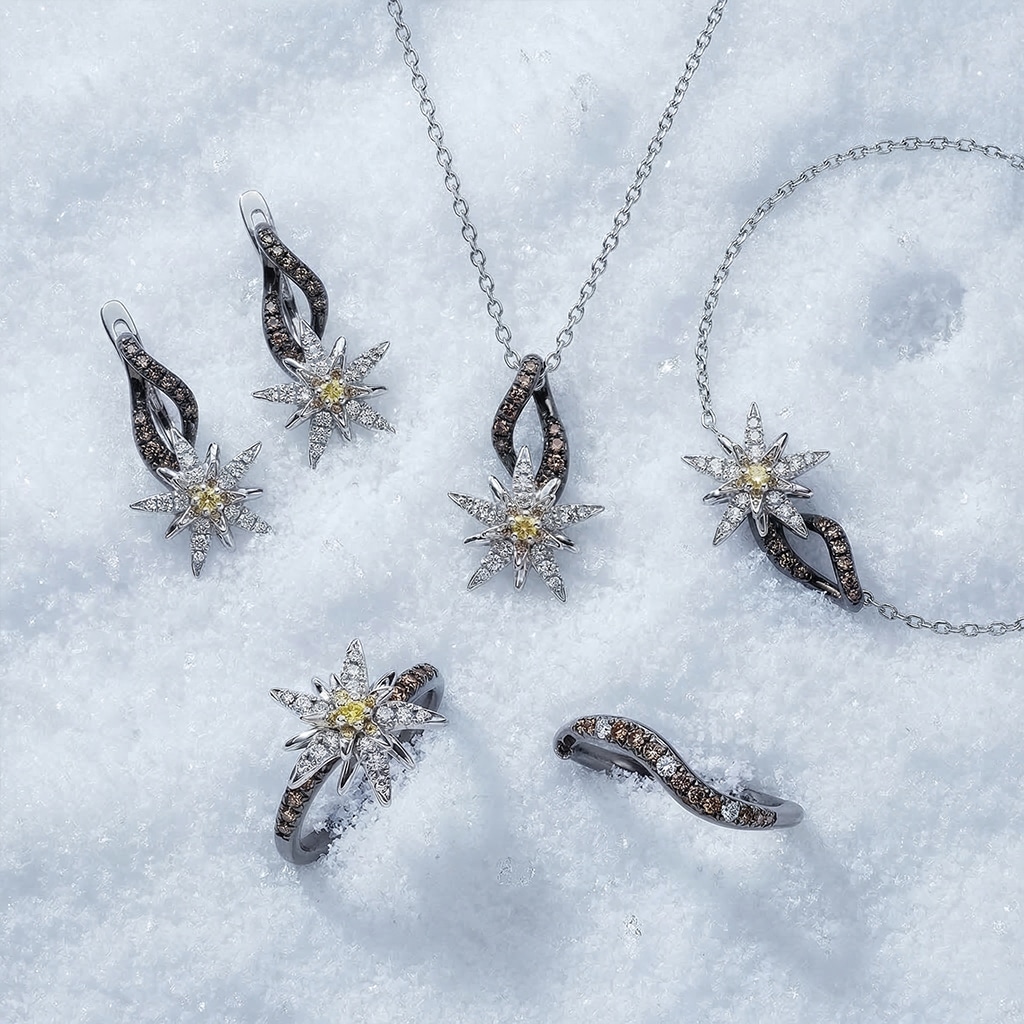 La collection Terre d’Edelweiss rend hommage aux paysages alpins et à la pureté de cette fleur rare qui pousse au cœur des montagnes. Les créations s’inspirent de la force et de la délicatesse de la nature sauvage, où le diamant évoque l’éclat des sommets enneigés. Une collection à la fois poétique et intemporelle, qui célèbre la beauté des hauteurs et l’exigence de la joaillerie.